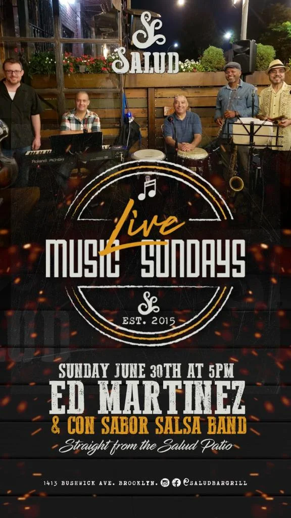 Live music Sunday, June 30, 2019 5:00 PM 8:00 PM 17:00 20:00 Google Calendar ICS Son, Mambo and Latin JazzEd Martinez & Con Sabor Salsa Band@ Salud Bar & Grill1436, 1413 Bushwick Ave, Brooklyn, NY 11207